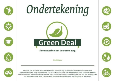 Bij Health4you zijn we ons bewust van de impact die onze activiteiten hebben op het milieu en de gezondheid van mensen. Ook binnen de zorg vinden wij duurzaamheid van groot belang. Daarom zetten we ons actief in voor duurzaamheid, in lijn met de Green Deal Duurzame Zorg.